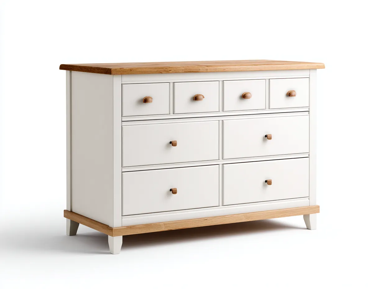 Questa cassettiera è progettata per offrire una soluzione di contenimento funzionale e ordinata all'interno della camera da letto o di altri ambienti domestici. Le linee morbide e il profilo equilibrato creano un aspetto classico e accogliente, facilmente abbinabile a diversi stili di arredamento.
