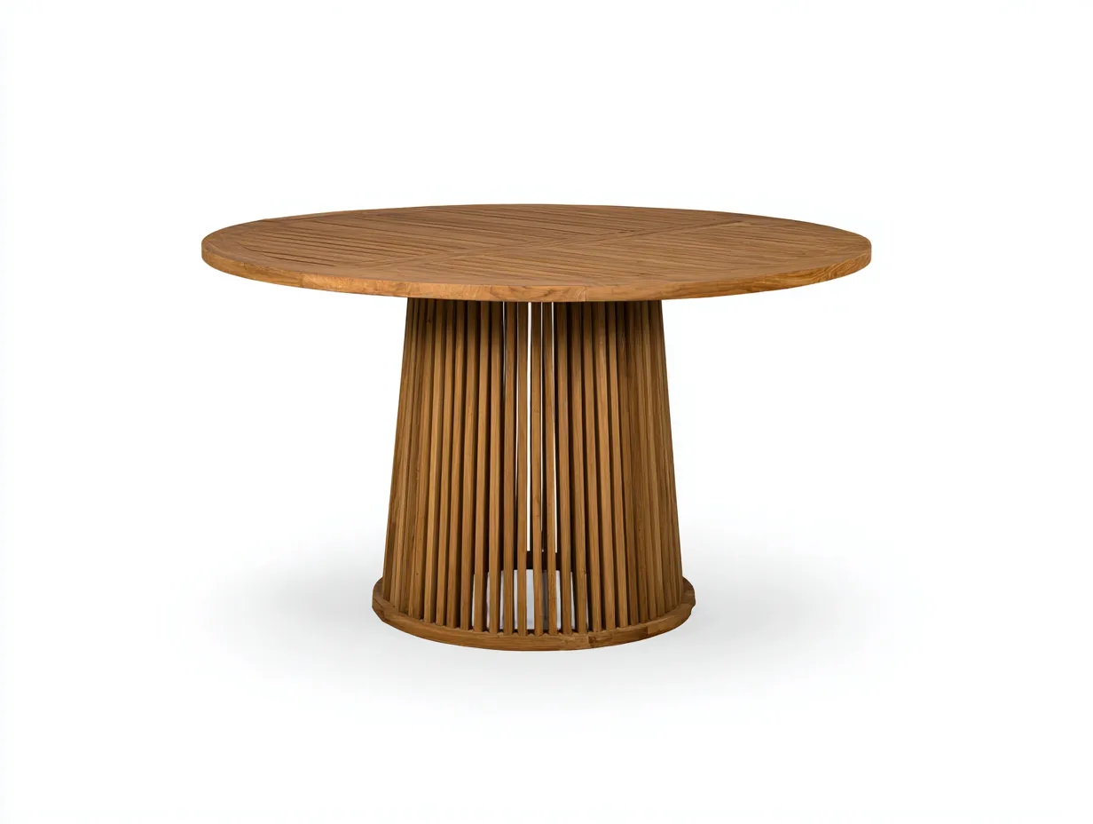La struttura è realizzata in legno di colore naturale. Il piano rotondo presenta una lavorazione a doghe regolari, mentre la base centrale con elementi verticali garantisce stabilità strutturale e continuità estetica, valorizzando l'aspetto materico del legno.