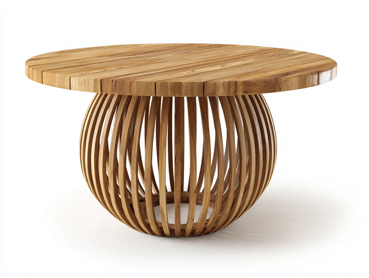 La struttura è realizzata in legno di colore naturale. Il piano rotondo presenta una lavorazione a listelli lineari, mentre la base centrale a elementi curvati verticali garantisce stabilità strutturale e valorizza l'estetica naturale del materiale.